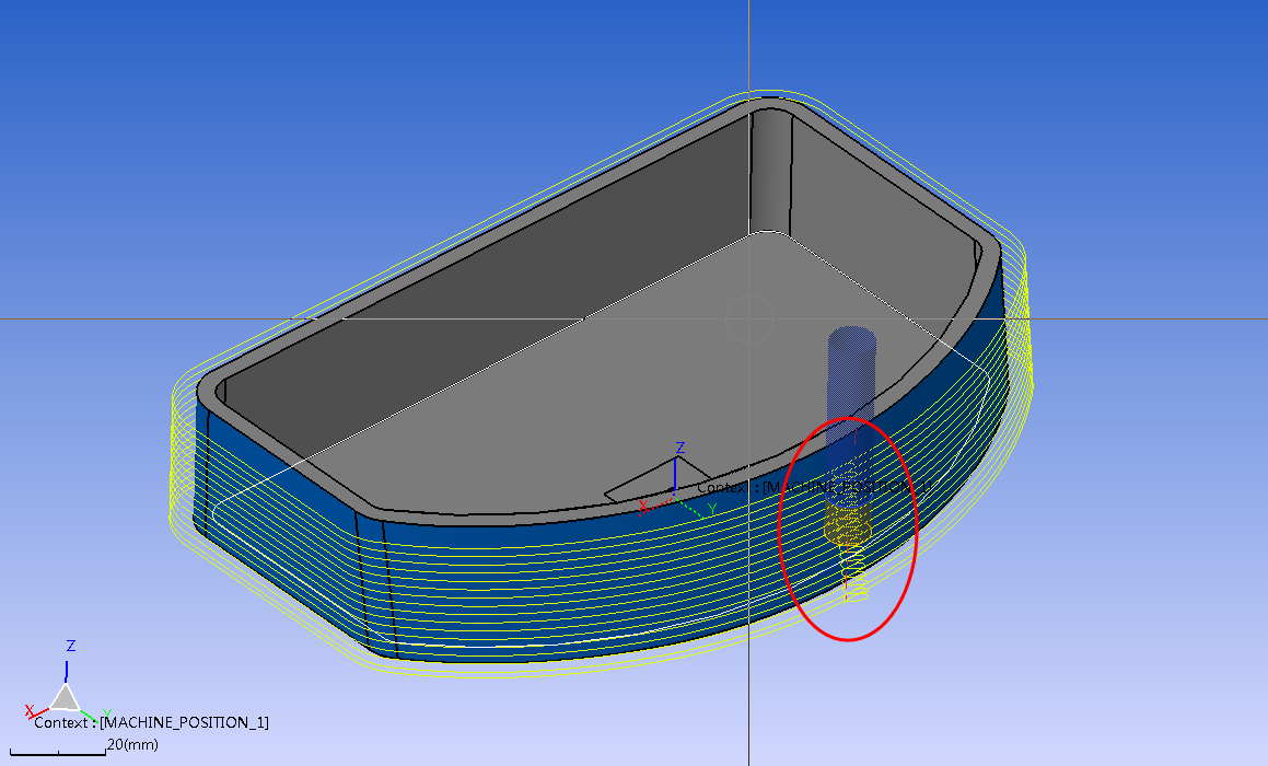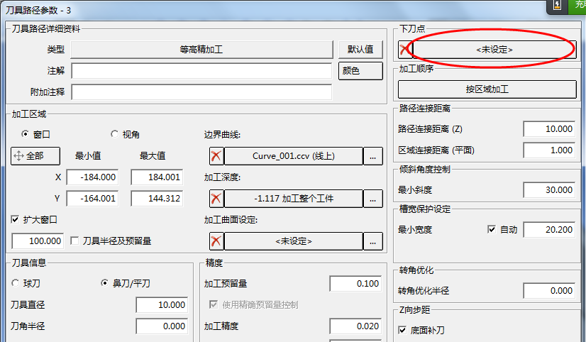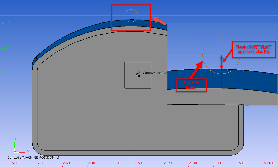 也就是比如,案例中使用D10的刀具,预留量是0.1,那下刀点有效设置范围是距离加工面(10/2)+0.1=5.1的范围内。