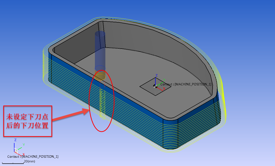 当设定下刀点后,下刀位置可以根据用户设置的下刀点去进退刀。但是有个条件:下刀点位置距离所加工面不能超过所使用刀具半径+预留量,