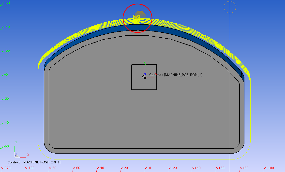 以上图为例,用等高精加工的方式加工外围一圈蓝色的面。当未设定下刀点的时候,计算出来的刀路,下刀位置是worknc自动设定的位置,如下