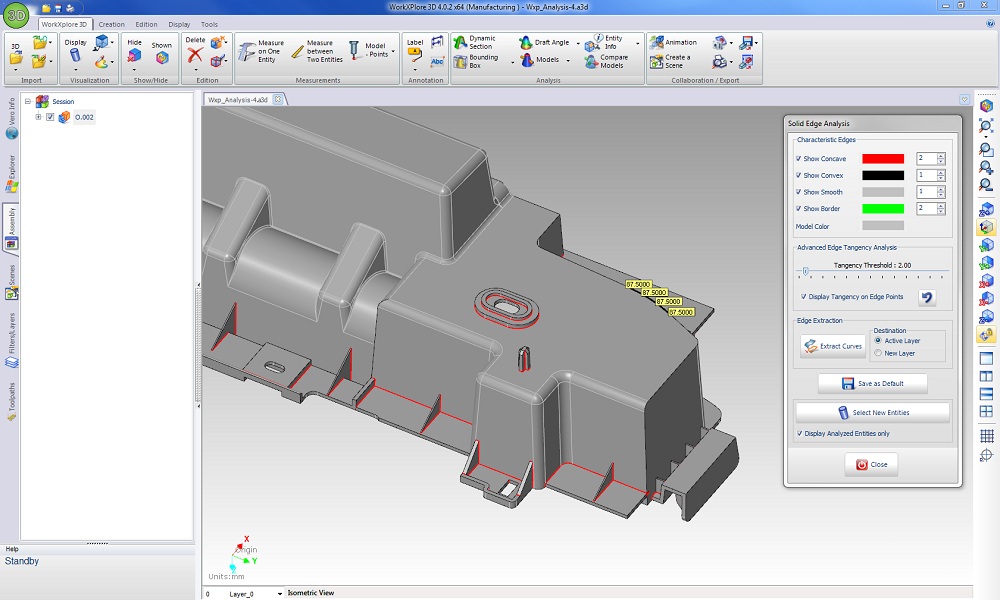 拔模角度的计算和显示速度极快,甚至对于非常大的零件也是如此。WorkXPlore 3D 根据出模方向自动为不同角度的区域和倒扣区域添加不同的颜色。在曲面上拖动鼠标时可动态显示精确出模角数值,并能默认插入 3D 模型。