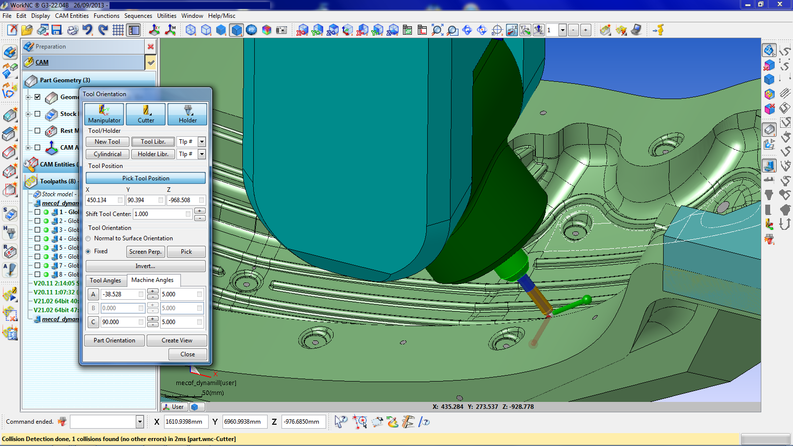 在WorkNC中创建动态刀把库,通过定义的刀把在工件与刀把之间做碰撞检测。